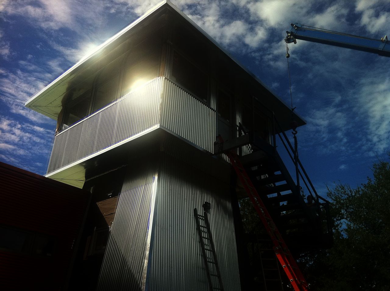 The tower stair railing is getting craned on at the Diaz Residence. We are still waiting to go out to the galvanizers. The siding is almost complete as well. For waterproofing reasons the siding can't be finalized until after the beams and stair come back from the galvanizers.
